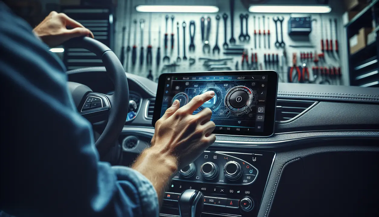 Et fotografi taget i et bilværksted, hvor en moderne bils dashboard og infotainmentsystem er tændt. En hånd er synligt i færd med at navigere i indstillingerne på skærmen, omgivet af værktøj og et tydeligt professionelt miljø. Fokus på teknologi, præcis udførsel og bilens elektroniske systemer.