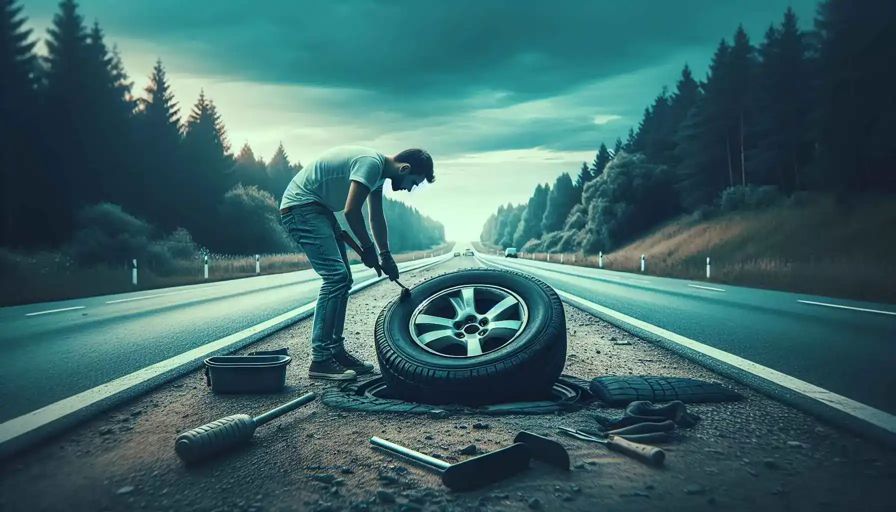 Mand reparerer punkteret dæk på vej med værktøj spredt omkring og træer i baggrunden.