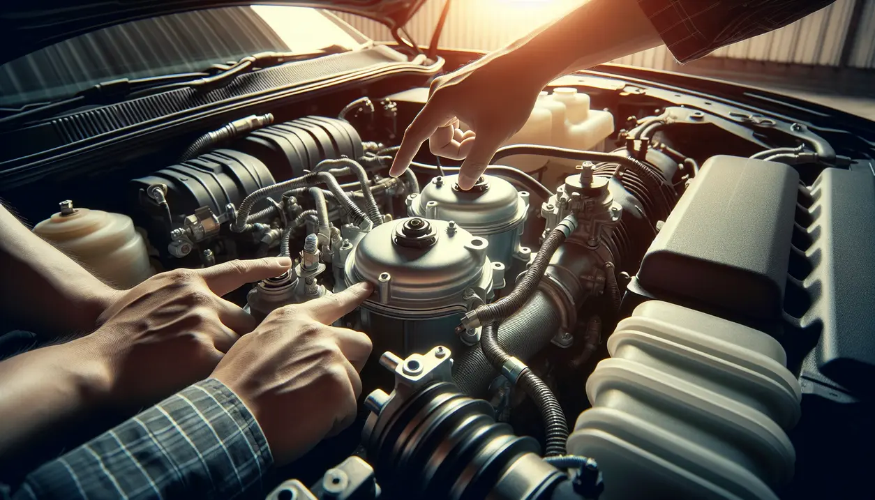 Et fotografi af en bilmotor, hvor fokus er på bremseforstærkeren (vakuumforstærker). Motorhjelmen er åben, og hænder peger eller arbejder på bremseforstærkeren, hvilket indikerer fejlfinding eller reparation. Skarpt dagslys og et tydeligt blik på komponenterne; billedet signalerer både teknik og tryghed.