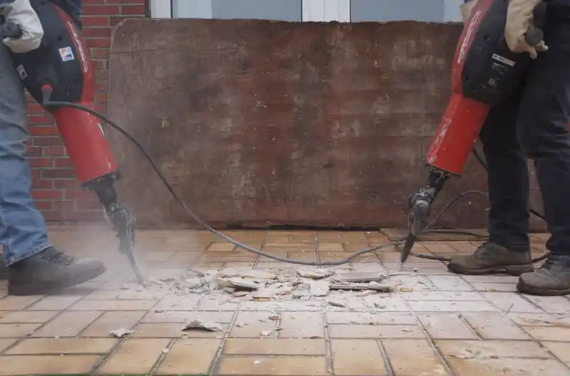 En borehammer med mejsel er ideel til opgaven, da den giver effektiv nedbrydning af fliser med SDS-fæstet og hammerfunktionen.