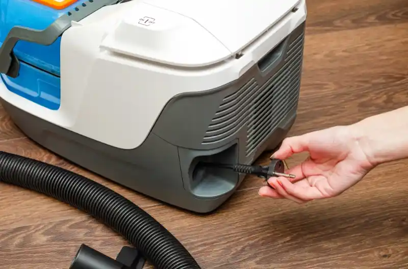 Person afbryder strømmen til hvid støvsuger for at løse kabelproblemer.