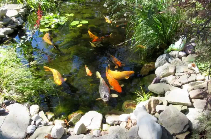 Koi svømmer i en velanlagt dam med frodig beplantning, illustrerer koidam design og æstetik.