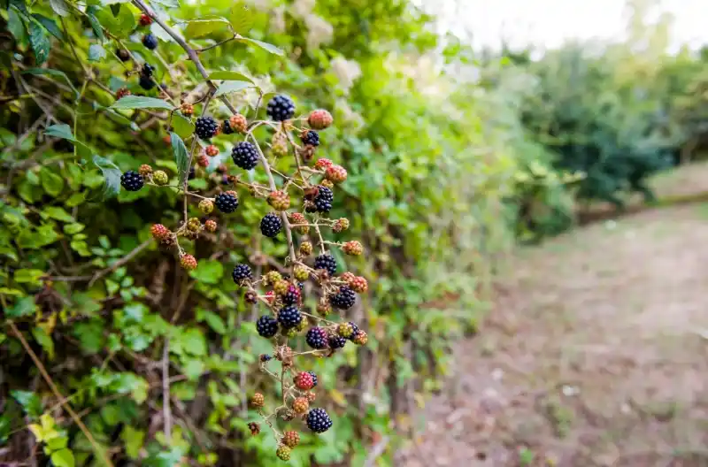 Modne brombær på busk i haven klar til plukning.