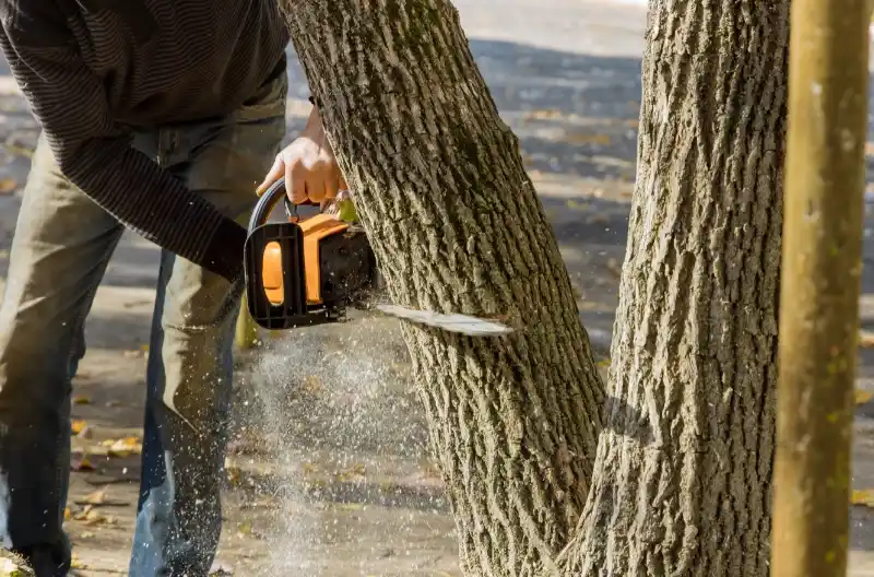 - Fjerning af grene: Trim nederste grene for at lette fældning og sikkerhed. Brug en håndsav eller en stangsav til at fjerne grene.