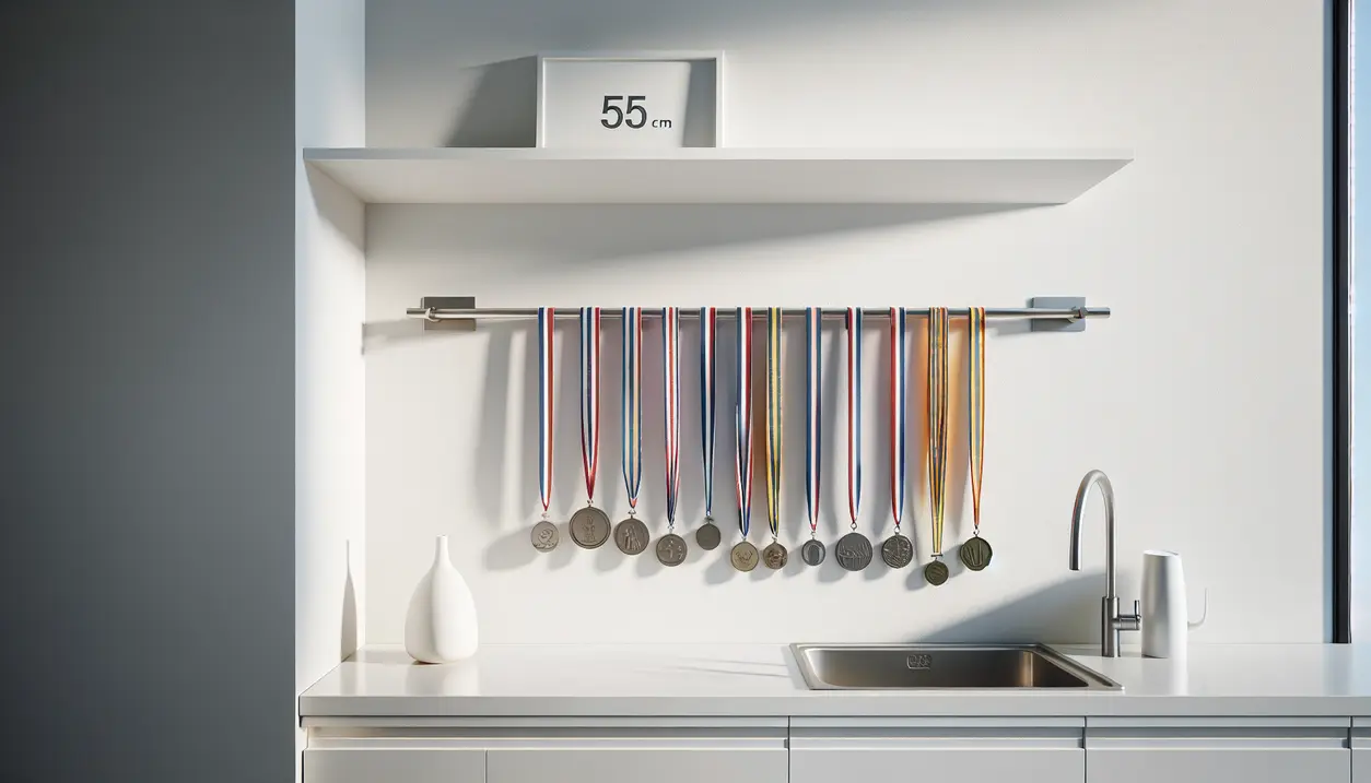 Monter en FINTORP køkkenskinne med både kroge til medaljer og clips til at fastgøre dine racestartnumre. Denne løsning giver dig mulighed for at vise både medaljer og minder fra løbene på samme sted.