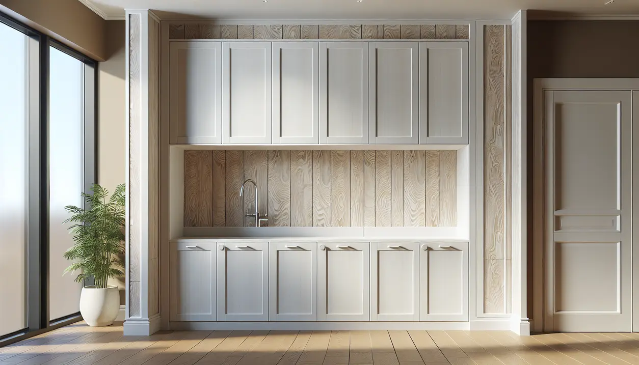 Træmønstret tapet bag skabene giver rummet et varmt og dyrt udseende uden omkostningen ved ægte træpaneler. Tapetet sættes op på væggen bag skabene, før de monteres, og skaber dybde og tekstur i alkoven.