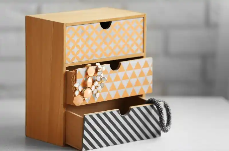 Minikommode med smykker, der hænger ud over kanten, organiseret i MOPPE minikommode.