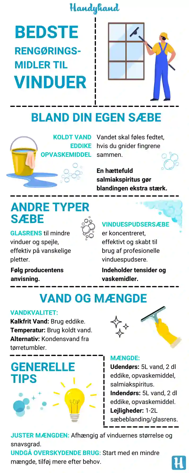 Vandkvaliteten spiller i nogle tilfælde en mere afgørende rolle end rengøringsmidlet, når du pudser vinduer. Det rette vand gør det nemmere at undgå løbere og striber. Her er nogle tips til at få det bedst mulige resultat: